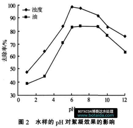 試驗(yàn)采取方法2 的投加順序, 通過改變水樣的pH 來考察其對絮凝效果的影響,結(jié)果見圖2?