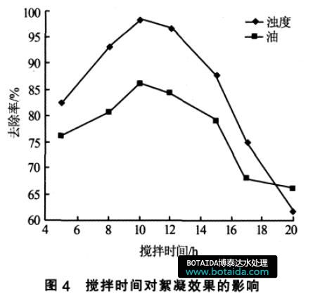 由圖4 可知,攪拌時間約10 min 時,絮凝效果最好?攪拌時間過長,將使本應(yīng)該沉淀的顆粒又分散成不能沉淀的細(xì)小顆粒,降低了絮凝效果;而攪拌時間過短,則會使絮凝劑和顆粒物不能充分接觸及吸附,從而不利于絮凝劑對膠體顆粒的捕集, 使絮凝劑的效能不能充分發(fā)揮.