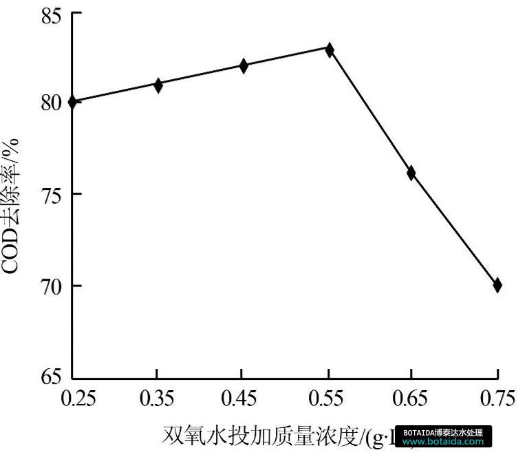 在pH=3.0,鐵炭總質(zhì)量濃度20 g/L,反應(yīng)時間40 min,MnO2投加質(zhì)量濃度為2.50 g/L,鐵炭比3∶1條件下,分別加入0.25、0.35、0.45、0.55、0.65、0.75 g/L H2O2進行實驗,考察H2O2對微電解處理廢水體系的催化作用,結(jié)果如圖3所示。