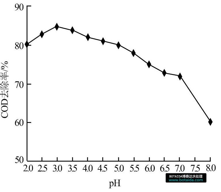 由圖4可以看出,在酸性條件下,隨pH的增加,廢水COD去除率增加,在pH=3.0時有最佳效果。當(dāng)pH小于3.0時,鐵屑與酸反應(yīng)生成的氫氣大量覆蓋在鐵屑的表面,減小了鐵屑的有效表面積,降低了原電池效應(yīng),從而使處理效果下降。而且溶液pH過低,會破壞絮凝體,使溶液因Fe2++和Fe3++濃度增大而色度增加。當(dāng)pH大于3.0時,H+濃度逐漸降低,陰極的反應(yīng)效果也下降。所以選擇適宜的進水pH為3.0。