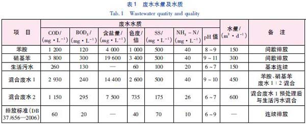 廢水來(lái)自還原和精制過(guò)程,主要分兩部分,其中苯胺進(jìn)水pH 值為8~9,廢水量為150 m3 /d; 硝基苯進(jìn)水pH 值為9~11,廢水量為300 m3 /d; 混合廢水量為450 m3 /d,COD 約為3 000 mg /L,含鹽量高,色度較高,氨氮含量高,是一種濃度高、成分復(fù)雜、難降解的有機(jī)化工廢水。