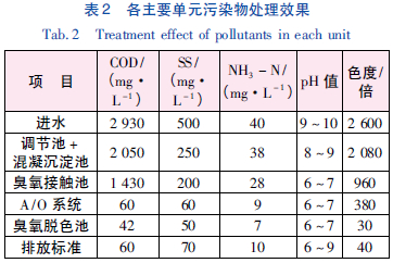 本工程經(jīng)過(guò)近2 個(gè)月的調(diào)試運(yùn)行后,出水水質(zhì)穩(wěn)定,COD 總?cè)コ蕿?8.6%,達(dá)到設(shè)計(jì)要求。各單元的處理效果見(jiàn)表2。