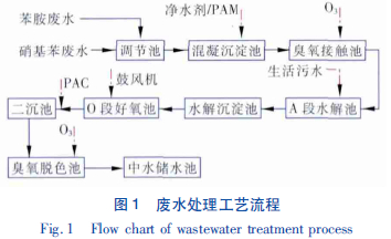 苯胺、硝基苯綜合廢水中含有大量難降解有機(jī)物,COD 值較高,可生化性極差(一般B /C 值為0 ~0.1) ,屬于高含鹽廢水,因此綜合考慮多種因素,決定采用物化與生化處理相結(jié)合的工藝。以混凝沉淀和臭氧氧化作為預(yù)處理單元,不會(huì)提高廢水的含鹽量,但可以提高廢水的可生化性,使A/O 生物系統(tǒng)處理效率大幅提高; 在末端再進(jìn)行臭氧氧化脫色處理可確保出水色度達(dá)標(biāo)。工藝流程見(jiàn)圖1。