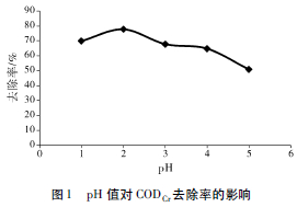 控制其他反應(yīng)條件不變,鐵炭質(zhì)量比為1∶3,氯化鈉投加量為200 mg/L,攪拌時(shí)間為30 min,在不同的pH值(1、2、3、4、5) 下進(jìn)行反應(yīng)。測(cè)定各水樣的CODCr值,計(jì)算CODCr去除率,結(jié)果見圖1。