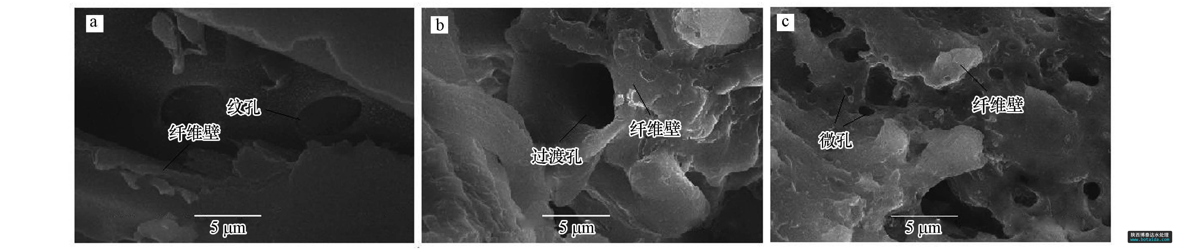 用JSM-6380LV掃描電鏡對原木粉、芐基化木粉、多微孔芐基化木粉進行了分析(圖 4).對比原木粉(圖 4a)和芐基化木粉(圖 4b)發(fā)現(xiàn),原木粉中封閉的紋孔清晰可見,纖維壁堅硬、平整.原木粉經(jīng)芐基化改性后(圖 4b),紋孔膜破裂,纖維壁膨松、柔軟,過渡孔清晰可見.芐基化木粉經(jīng)水熱處理后得到多微孔芐基化木粉(圖 4c),纖維壁明顯破裂,產(chǎn)生了許多微孔.這一方面是由于水蒸汽分子具有高能量、高穿透力,可將芐基化木粉纖維壁上的微纖絲部分沖破,并造成斷裂,產(chǎn)生新的微孔或超微孔(王瑀,2008);另一方面,在高熱水蒸汽分子沖擊下,芐基化木粉結(jié)晶區(qū)中纖維素的氫鍵斷裂,纖維分子從彎曲狀態(tài)變成伸展狀態(tài),纖維壁伸展開來,產(chǎn)生了明顯的“膨化效應(yīng)”,有效地擴大了芐基化木粉的過渡孔和微孔.此外,水熱處理中所加乳化劑OP-10能迅速乳化從纖維壁間釋放出的膠狀物質(zhì),有利于及時清洗疏通孔道.由此可見,木粉經(jīng)芐基化及水熱處理后,木材纖維壁變得膨松,產(chǎn)生大量的微孔或超微孔,有效地擴大了芐基化木粉吸附重金屬離子的比表面積,同時使纖維素和半纖維素分子上的羥基更加裸露,增加了對重金屬離子絡(luò)合的羥基數(shù)目,從而提高了對重金屬離子的吸附性能.