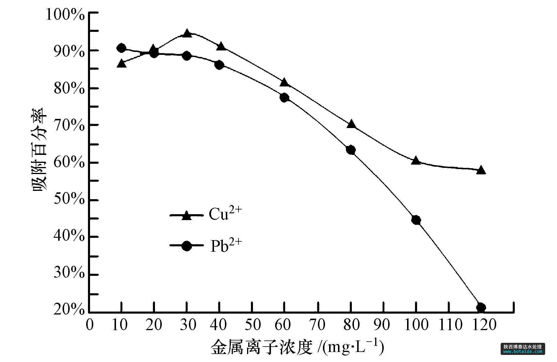 在16個100 mL錐形瓶中,分別加入0.500 g多微孔芐基化木粉(增重率35.5%),依次加入10、20、30、40、60、80、100、120 mg · L-1不同離子濃度的溶液25 mL,控制水溫為40 ℃,比較不同濃度的Cu2+和Pb2+溶液在60 min內(nèi)對吸附百分率的影響(圖 9).結(jié)果表明:①隨著溶液中金屬離子濃度的增加,多微孔芐基化木粉對Cu2+的吸附百分率呈現(xiàn)出先增加后下降的趨勢,而對Pb2+的吸附百分率一直呈現(xiàn)緩慢下降趨勢.②當Cu2+溶液初始濃度為30 mg · L-1時,多微孔芐基化木粉對Cu2+溶液的吸附百分率最高,為94.4%;當Pb2+溶液的初始濃度為10 mg · L-1時,多微孔芐基化木粉對Pb2+溶液的吸附百分率最高,達90.7%.這也反映出在有限的吸附時間內(nèi),多微孔芐基化木粉對Pb2+的吸附較慢,因而達到吸附平衡的時間要比Cu2+更長.