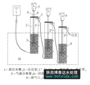 試驗裝置如圖 1 所示 ,MICR 由 3 根 D 80 mm× 1 000 mm 的有機玻璃管串聯而成,總有效容積為 12.81 L,分為 1#、2#、3# 反應室。各反應室均設 3 個孔徑為 8 mm 的取樣口,取樣口分別位于距離 反應室底部 100、350、700 mm 處,并用恒溫水浴槽控制試驗溫度為(35±1 ) ℃。 廢水從高位槽向 1# 反應室底部注入,然后由上部出水口經溢流堰順管道進入 2# 反應室底部,依次推進,經過 3# 反應室之后排出 。各反應室的氣體在集氣罩下方匯集,以泥水混合液的形式經提升管進入氣液分離器,氣體從排氣口排出,泥水混合液經回流管回流至反應室底部,形成液體內部循環(huán) 。
