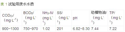 試驗所用乳品廢水取自廣西皇氏甲天下乳業(yè)股份有限公司 ( 主要水質參數見表 1 ),并根據需要添加了適量純牛奶,以提高 CODCr,以尿素為氮源 、磷酸二氫鉀為磷源,保持 m (CODCr) ∶ m (N) ∶ m (P) = 300 ∶5∶1 。為促進污泥馴化,適量添加含有 Fe、Ca、 Mn、Zn、Co、K 等微量元素的營養(yǎng)液。
