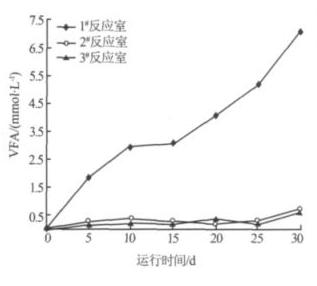 在厭氧消化過程中 ,甲烷菌主要利用 VFA 形成甲烷,因此 VFA 的積累程度及變化規(guī)律能夠很好地表征厭氧反應器的相分離狀態(tài)〔6〕。圖 5 為各反應室出水的 VFA 隨運行時間的變化情況。