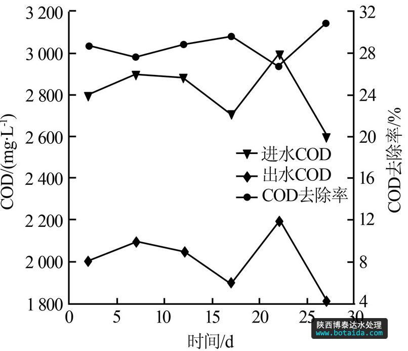 由圖 4可以看出,UASB工藝對(duì)COD的去除率基本穩(wěn)定在30%左右,出水COD約為2 000 mg/L。