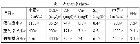 某電子公司是國(guó)內(nèi)重點(diǎn)集成電路封裝測(cè)試企業(yè),該公司主要從事半導(dǎo)體集成電路、半導(dǎo)體元器件的封裝測(cè)試業(yè)務(wù),其生產(chǎn)線廢水主要包括兩部分,一部分為晶元的減薄劃片廢水、另一部分為電鍍錫化廢水。減薄劃片廢水中主要含有大量的硅粉微粒,SS約2000mg/L左右,特性很穩(wěn)定,不易沉降,電導(dǎo)率僅為2-4µs/cm,東洋采用自主研發(fā)的二級(jí)連續(xù)UF膜系統(tǒng)進(jìn)行進(jìn)行廢水回收利用,廢水回收利用率≥90%,回收水質(zhì)好,同時(shí)回收硅粉。在此主要介紹電鍍錫化廢水的回用處理系統(tǒng);廢水中主要含有Cu、Sn、酸堿、有機(jī)物等,在該項(xiàng)目中首先要做好分質(zhì)分流是尤為重要,把錫化電鍍線上的廢水按照水中的成份及濃度來分質(zhì)收集,主要分為漂洗廢水、重污染廢水、有機(jī)槽廢液三路,水質(zhì)如下: