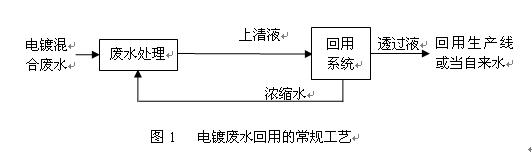 圖1是把所有電鍍廢水混合集中收集,先經(jīng)過物化或生物一系統(tǒng)處理,然后把上清液進(jìn)行膜系統(tǒng)回收,因在廢水處理過程中,投加了大量的PAC、PAM等,藥劑中含有大量的陽(yáng)離子物質(zhì)存在水中,很容易與回用膜元件表面電荷結(jié)合而堵塞膜元件,更不能保證很高的回收率,通?;厥章首罡邇H能達(dá)到50%,往往并不能保證長(zhǎng)期穩(wěn)定的運(yùn)行;因投加了大量的藥劑,使廢水的含鹽量也大大的增加,所以也降低了回用水水質(zhì);通過膜技術(shù)回用后的濃縮水重金屬通常會(huì)超標(biāo),不能直接排放,這樣只能回到廢水前處理系統(tǒng)中,從而增加了廢水處理部分的負(fù)荷及水量,嚴(yán)重影響廢水處理部分的效果,同時(shí)占地及土建投資也增大。