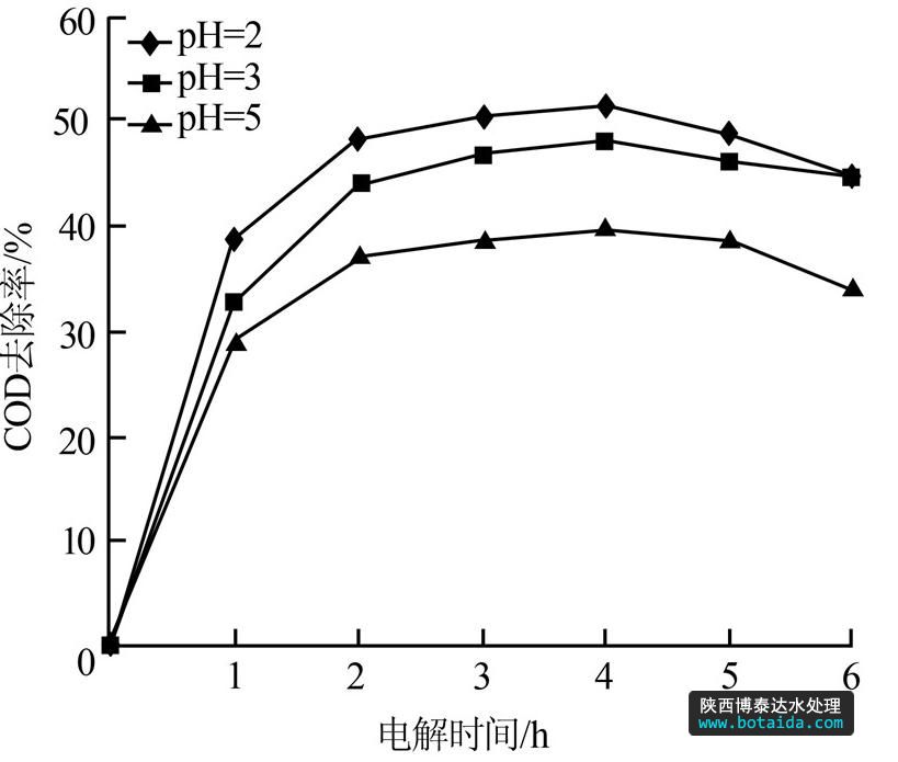 綜上不難發(fā)現(xiàn),當(dāng)滲濾液的pH分別為2、3、5 時,隨電解時間的延長,COD去除率進一步增加,但超過4 h后去除率基本不變;當(dāng)電解電壓為24、36 V,電解4 h時,COD去除率達到最大;極板間距為1.5 cm時,電解約4 h COD去除率也達到最大值。這說明采用Ir-Ta-Sn摻雜電極對垃圾滲濾液進行電催化降解時,電解時間不宜超過4 h,此時COD去除率已達到最大值;電解時間繼續(xù)延長,垃圾滲濾液中的COD不但不降低,反而會有一定程度的回升。因此合理控制電化學(xué)氧化時間,可以減少能耗,并提高COD去除率。