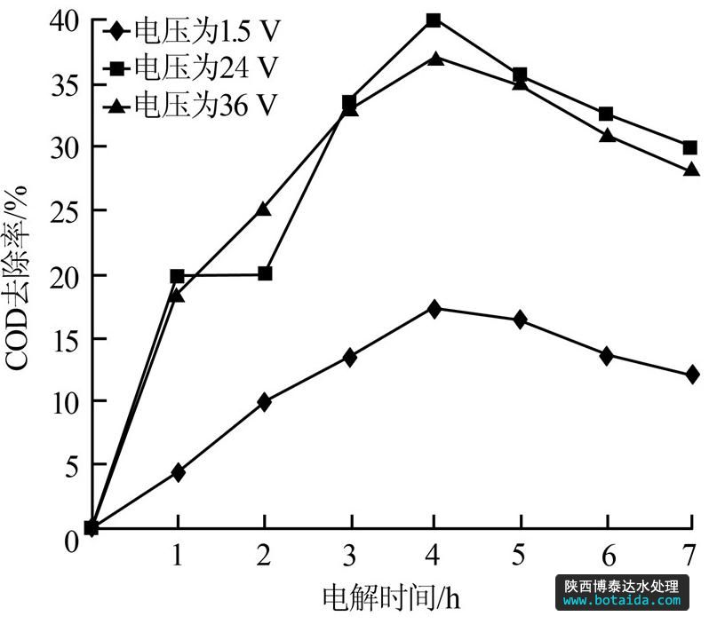 (2)當(dāng)電催化氧化時間達到約4h時,對垃圾滲濾液的COD去除率基本達到最大;當(dāng)電解電壓為24 V或36 V時,電催化氧化對COD的去除效果有明顯提高。
