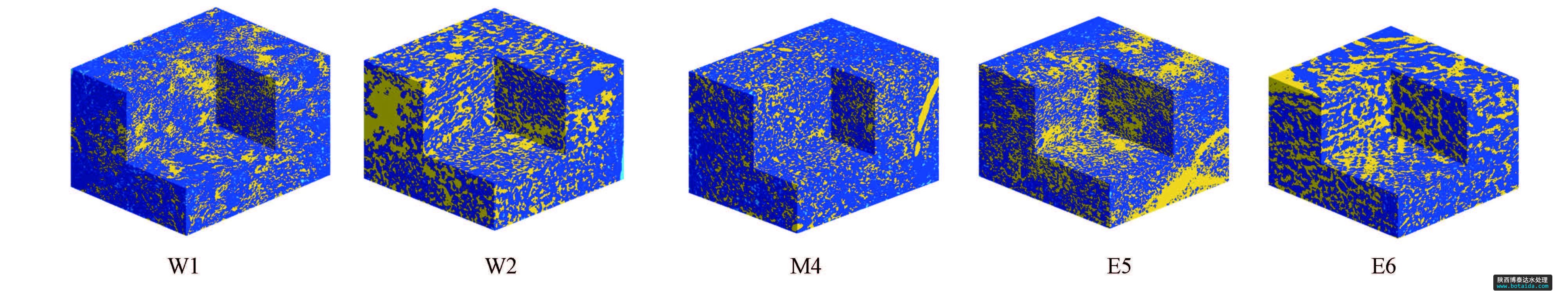 通過Mathematics軟件顯示沉積物各點三維孔隙結(jié)構(gòu),如圖 2所示,圖中深藍(lán)色部分為沉積物基質(zhì),黃色部分為連通孔,淺藍(lán)部分為孤立孔.
