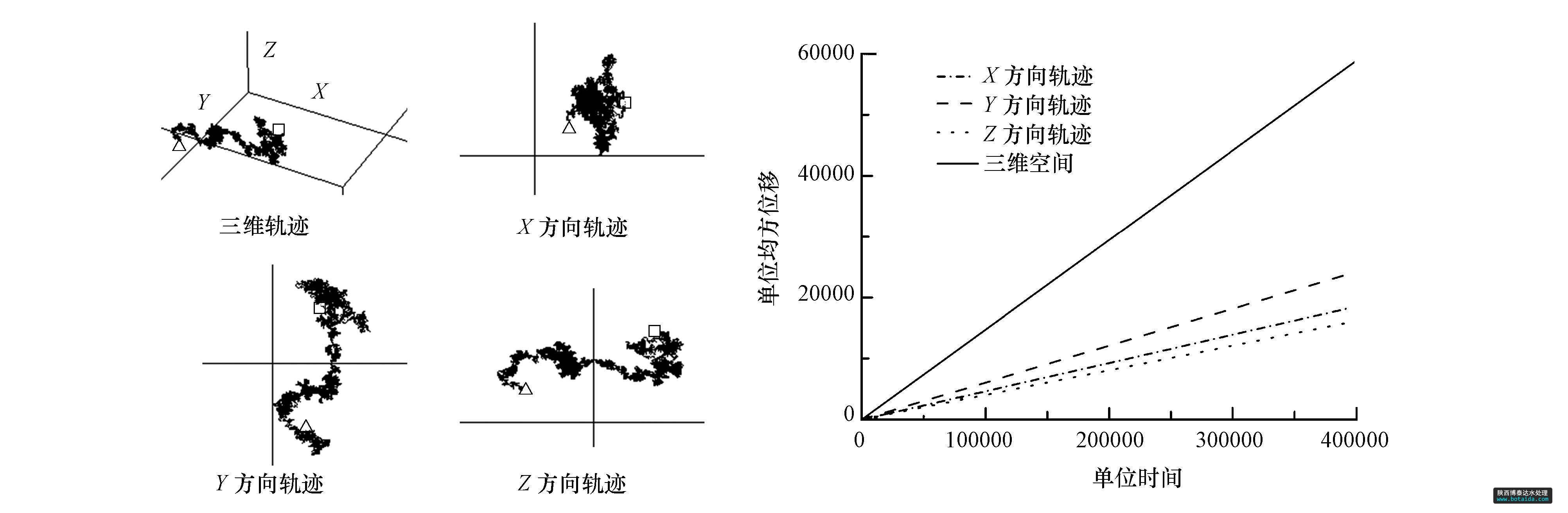 根據(jù)以上結(jié)果,利用Rwalk程序?qū)αW釉谧杂煽臻g與沉積物孔隙中的擴散進(jìn)行隨機行走模擬,結(jié)果見圖 3(以W1點1~2 cm深度內(nèi)樣品為例),其中,空心方框和三角分別表示行走軌跡的起點和終點.由于沉積物結(jié)構(gòu)的各向異性,根據(jù)不同方向的均方位移與時間統(tǒng)計結(jié)果可以得到不同方向的曲率值.