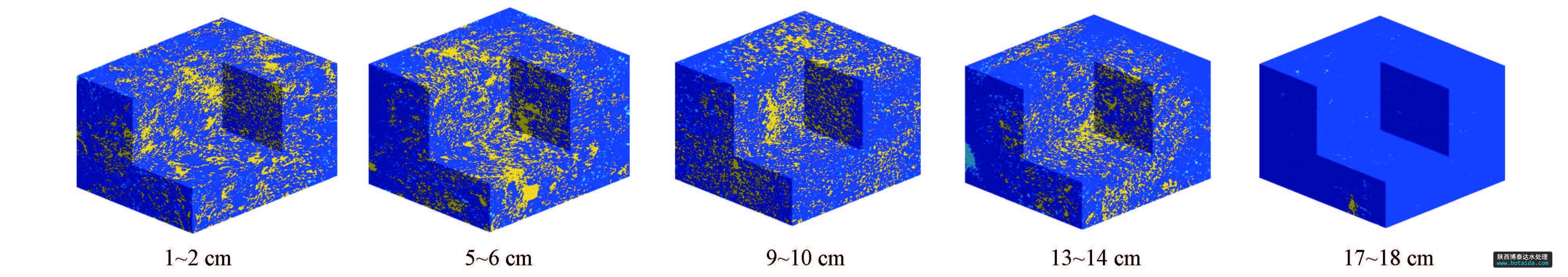 通過Mathematics軟件顯示沉積物不同深度樣品三維孔隙結(jié)構(gòu),如圖 4所示,圖中深藍(lán)色部分為沉積物基質(zhì),黃色部分為連通孔,淺藍(lán)部分為孤立孔.隨后利用Rwalk程序?qū)αW釉谧杂煽臻g與沉積物孔隙中的擴散進(jìn)行隨機行走模擬,計算曲率.