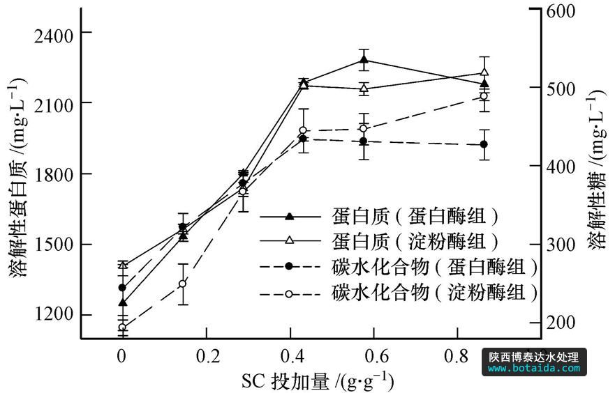 原污泥中的溶解性蛋白質(zhì)和碳水化合物濃度較低(溶解性蛋白質(zhì)73.0 mg · L-1,溶解性碳水化合物14.2 mg · L-1),表明其中的有機物主要以固體狀態(tài)存在,溶解性有機質(zhì)的含量較低.空白對照組(不加酶也不加SC)反應4 h后,污泥中的溶解性蛋白質(zhì)和碳水化合物濃度分別增加至400.0和79.0 mg · L-1.在水解酶的作用下,隨著污泥膠團的解聚和胞外聚合物的水解,大量有機質(zhì)由固相轉(zhuǎn)移至液相,成為溶解性物質(zhì).圖 1為蛋白酶和淀粉酶組實驗(均投加酶0.06 g · g-1)在不同SC投加量下(0、0.144、0.288、0.432、0.576、0.864 g · g-1),反應4 h后污泥中蛋白質(zhì)和碳水化合物濃度隨SC投加量的變化情況.由圖可知,只投加水解酶(不投加SC)時,溶解性蛋白質(zhì)由原污泥的73.0 mg · L-1分別增加至1250.0 mg · L-1(蛋白酶組)和1407.0 mg · L-1(淀粉酶組),溶解性碳水化合物由原來的14.2 mg · L-1分別增加至244.0 mg · L-1(蛋白酶組)和194.0 mg · L-1(淀粉酶組).污泥的主要成分是蛋白質(zhì),此研究中淀粉酶和蛋白酶促進污泥水解的效果差不多,其原因如下:一方面,Pinnekamp(1989)指出,碳水化合物和蛋白質(zhì)的可生物降解率分別為52.24%和39.70%,蛋白質(zhì)的可生物降解性較差,其水解在污泥水解過程中是限速步驟.在較短的時間內(nèi),碳水化合物的水解效率高于蛋白質(zhì).另一方面,EPS中碳水化合物可能與蛋白質(zhì)相結(jié)合,從而形成碳水化合物-碳水化合物、碳水化合物-蛋白質(zhì)、蛋白質(zhì)-蛋白質(zhì)相結(jié)合的結(jié)構,破壞其中任何一種物質(zhì),與其相結(jié)合的另一物質(zhì)也會隨之溶解出來(Sesay et al., .,2006).
