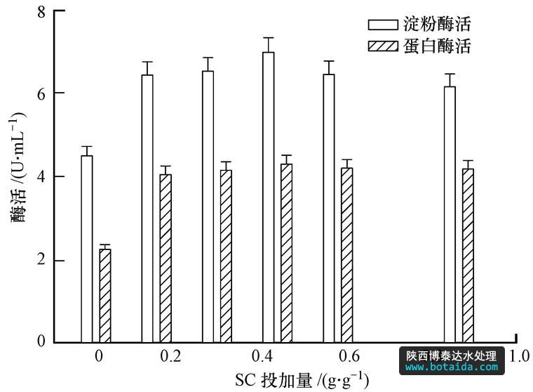 SC對污泥酶水解影響:設立2批次實驗(每批次包括6個實驗組),各批次均取400 mL污泥,分別投加蛋白酶、淀粉酶0.06 g · g-1(以TS 計,下同),SC以粉末形式投加,SC的投加量分別為0、0.144、0.288、0.432、0.576、0.864 g · g-1,隨后向各錐形瓶中通入氮氣約4 min以完全驅(qū)除殘留空氣,加塞置于50℃水浴振蕩器上反應,4 h后取樣測定水解產(chǎn)物及蛋白酶和淀粉酶的活性,并進行分析.同時設定空白對照組,除不加酶和SC外,其它條件與實驗組均相同.