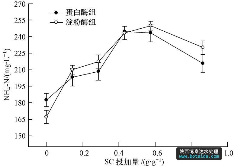 圖 3為反應4 h后,污泥中氨氮濃度隨SC投加量的變化情況.在水解酶的催化作用下,污泥中的含氮物質(zhì)——主要為蛋白質(zhì)轉(zhuǎn)化為二肽、氨基酸,氨基酸進一步轉(zhuǎn)化為氨(Shanableh et al., .,2001).因此,蛋白質(zhì)不斷溶出的同時,污泥液相中的氨氮濃度也不斷提高.只投加水解酶(不投加SC)時,氨氮濃度由原污泥的60.0 mg · L-1分別增加至182.0 mg · L-1(蛋白酶組)和167.0 mg · L-1(淀粉酶組).當SC投加量為0.432 g · g-1時,氨氮濃度分別增加至245.0 mg · L-1(蛋白酶組)和243.0 mg · L-1(淀粉酶組).蛋白質(zhì)和碳水化合物是剩余污泥的主要組成成分,脂肪含量很少,基本可以忽略.蛋白質(zhì)的可生化降解性較差,其水解在污泥消化過程中是限速步驟,決定了此過程中有機物的降解程度(劉常青等,2008).SC的投加提高了蛋白質(zhì)的降解速率,一方面是由于SC的投加促使更多的蛋白質(zhì)溶解到液相,其降解速率高于固相中的蛋白質(zhì).另一方面,SC的投加破壞了EPS的網(wǎng)絡結(jié)構,水解酶得到釋放,從而增加了其與底物的接觸機會,蛋白質(zhì)的轉(zhuǎn)化效率得到提高.