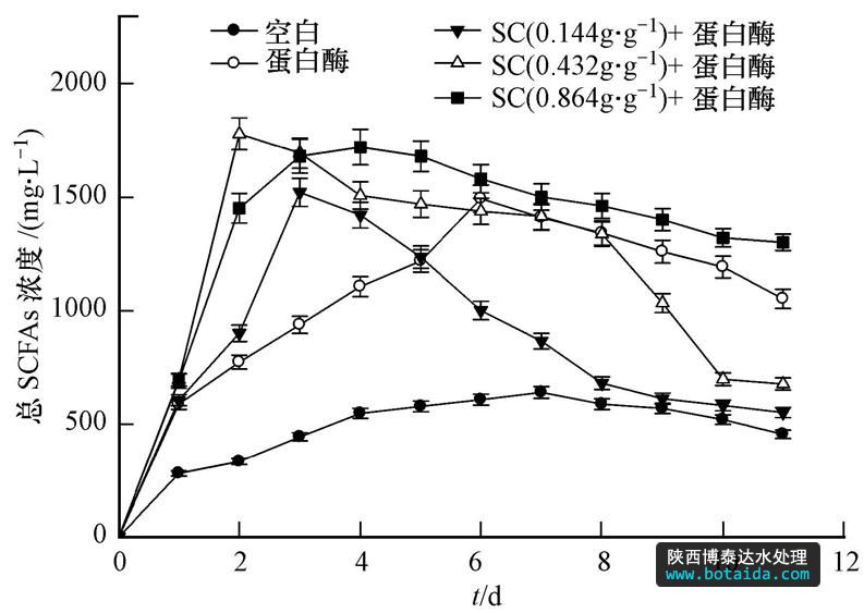 污泥酸化過程中產(chǎn)生的SCFAs與溶解性蛋白質(zhì)和碳水化合物含量是緊密相關的(Yu et al.,2003),因此,溶解性有機物越多,產(chǎn)生的SCFAs也越多.圖 4為空白(不加酶也不加SC)、蛋白酶(0.06 g · g-1,以TS計,下同)和SC+蛋白酶組(SC 0.144、0.432和0.864 g · g-1,蛋白酶0.06 g · g-1)產(chǎn)生的總SCFAs.由圖可知,蛋白酶和SC+蛋白酶組產(chǎn)生的總SCFAs高于空白對照組,最大SCFAs積累量分別達到1499和1788 mg · L-1(以COD計)(SC 0.432 g · g-1),分別是空白對照組的2.33和2.78倍.SC的投加促使大量固相有機物溶解到液相,同時也增加了污泥中水解酶含量.大分子溶解性有機物,如蛋白質(zhì)和碳水化合物等在水解酶的作用下得到高效水解,為酸化過程提供了更多的酸化底物,從而導致SCFAs的大量積累.