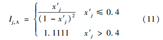 式中,x′j為指標(biāo)j的規(guī)范值;分母中(1- x′j)為環(huán)境樣本到設(shè)定的“參照級(jí)”樣本的規(guī)范距離;Ij為指標(biāo)j的環(huán)境質(zhì)量引力普適指數(shù);x′b為對(duì)不同類型的環(huán)境設(shè)置的指標(biāo)規(guī)范值的閾值.這是因?yàn)橐χ笖?shù)值Ij近似呈規(guī)范值x′j的三次冪增大,為了限制過大的x′j對(duì)綜合引力指數(shù)Ij的影響,而設(shè)置了閾值xb.xb一般設(shè)置為某類環(huán)境最嚴(yán)重污染等級(jí)的所有指標(biāo)規(guī)范值均值 ′j的1.1~1.3倍.因此,對(duì)水質(zhì)指標(biāo)分5級(jí)標(biāo)準(zhǔn),其最嚴(yán)重污染的第5級(jí)標(biāo)準(zhǔn)的所有指標(biāo)規(guī)范值均值 ′j5≈0.45,故取其均值的1.1倍,即取閾值x′b=0.5;而對(duì)空氣指標(biāo)分3級(jí)標(biāo)準(zhǔn),其嚴(yán)重污染的第3級(jí)標(biāo)準(zhǔn)所有指標(biāo)規(guī)范值均值 ′j3≈0.31,近似取其均值的1.3倍,即取閾值x′b=0.4.若污染物濃度的規(guī)范值x′j≥x′jb,則表明其對(duì)環(huán)境污染的危害程度已趨于飽和.從而得到4類水體的任一水質(zhì)指標(biāo)j的規(guī)范值x′j所表征水體樣本與指標(biāo)j的“參照級(jí)”樣本之間的引力指數(shù)公式如式(10)所示.