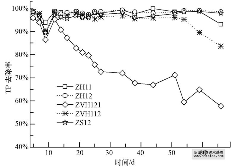 圖 6展示了反應(yīng)器運(yùn)行前70 d,各反應(yīng)器中TP去除率的情況.ZH12、ZH11、ZS12填料組合對磷一直保持著較高的去除率,而ZVH121、ZVH112填料組合在運(yùn)行期間磷去除率的降低,是因?yàn)樵谠摻M合中空心磚含量較少,在反應(yīng)器運(yùn)行一段時(shí)間后,反應(yīng)器中的空心磚對磷吸附達(dá)到飽和.含鋼渣的ZS12組合對磷的去除效果穩(wěn)定且較高,但相比較于其他污染物的去除,鋼渣并不適于在人工濕地處理含磷較低廢水的工程中應(yīng)用.而空心磚不僅能有效地去除磷,且對氮的去除無明顯負(fù)作用,適合添加到填料組合中,在不影響其它污染物去除效果的同時(shí),用于提高人工濕地中磷的去除效果.