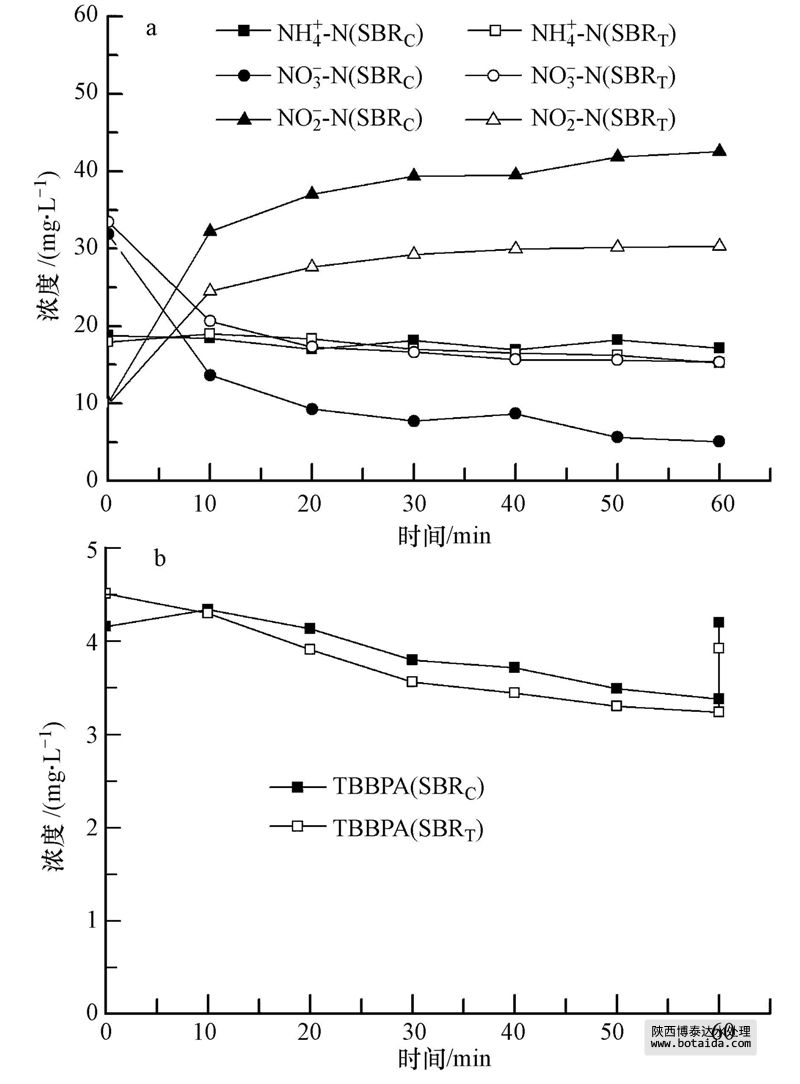 兩套SBR反應(yīng)器穩(wěn)定運(yùn)行狀態(tài)下,出水乙酸鈉和亞硝酸鹽濃度低于檢測(cè)方法的檢出限,出水PO3-4-P,NH+4-N濃度均小于0.5 mg · L-1,反應(yīng)器具有良好的脫氮除磷功能;SBRC反應(yīng)器出水NO-3-N濃度為(12.9±2.2)mg · L-1,SBRT反應(yīng)器出水NO-3-N濃度為(15.3±2.0)mg · L-1.表明TBBPA對(duì)SBR反應(yīng)器硝化和除磷效率沒有太大影響,但對(duì)出水硝態(tài)氮濃度略有影響.