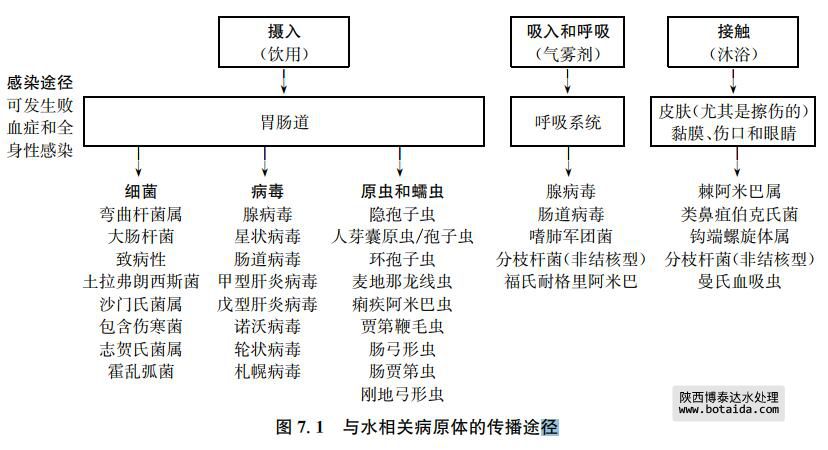 盡管使用被污染飲用水產(chǎn)生的風(fēng)險最大,但其他傳播途徑也可導(dǎo)致疾病發(fā)生,一些病原 體可通過多種途徑傳播(例如:腺病毒)(見圖7.1)。吸入水滴(氣霧劑)可引發(fā)某些嚴(yán)重疾 病,這是由于水滴中溫度適宜,且有營養(yǎng)物質(zhì)存在,致病微生物可以快速繁殖。這些疾病包 括由軍團菌屬引起的軍團病,以及由福氏耐格里阿米巴[原發(fā)性阿米巴腦膜腦炎(PAM)]和 棘阿米巴屬(阿米巴腦膜炎,肺部感染)引起的疾病。
