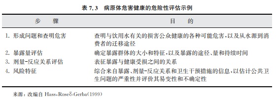 風險評估、包括QMRA,首先從提出問題開始,其目的是確定各種可能的危害及危 害從源頭到消費者的各種遷移路徑。然后,將人接觸病原體的情況(環(huán)境濃度及攝入 量)和所選(或參考)生物體的劑量 反應關系綜合起來以描繪出風險的特征。結合其他 信息(社會、文化、政治、經(jīng)濟、環(huán)境等)就可提出一些優(yōu)先選用的管理辦法。為鼓勵利 益相關各方的支持和參與,在處理過程的每一階段,都能做到透明并主動溝通有關危險 性的信息是非常重要的。表7.3給出了危險性評估的一個例子并在下面進行詳細 描述。