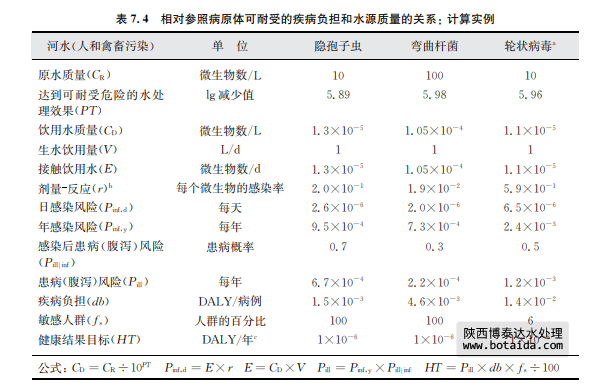 當需將一個病例中發(fā)生特定疾病的風險轉化為疾病負擔時,可以使用DALY(metric disabilityadjustedlifeyear)(見第3章3.1)。這不但反映了急性終點反應(腹瀉),也反映了 死亡率和更嚴重的終點反應(如與彎曲桿菌有關的格林 巴利綜合癥,即急性感染性多發(fā)神 經(jīng)炎)。每個病例的疾病負擔變化很大。例如,每1000例輪狀病毒的疾病負擔在低收入地 區(qū)為480DALYs,而且還經(jīng)常發(fā)生兒童死亡。但在大多數(shù)居民都能得到醫(yī)療救助的高收入 地區(qū)僅為14DALYs/1000例(見附錄1支持性文件《世界衛(wèi)生組織飲用水水質(zhì)準則中公共 衛(wèi)生風險量化》)。由于這種疾病負擔上的明顯差別,為了要達到相同的危險程度(以 DALYs/人/年表示),在相同水源質(zhì)量的情況下,在低收入地區(qū)就需要實施更嚴格的水處 理。表7.4中10-6DALY/人/年這樣的健康結果目標最好能與具體國情相結合。表7.4中 沒有免疫缺陷人群的計算數(shù)值(如 HIV/AIDS患者中的隱孢子蟲?。?,在某些國家,這些人群的數(shù)量還是很多的。3.2節(jié)中有更多關于DALY的信息,及關于如何將其用于獲取風險 參考值。