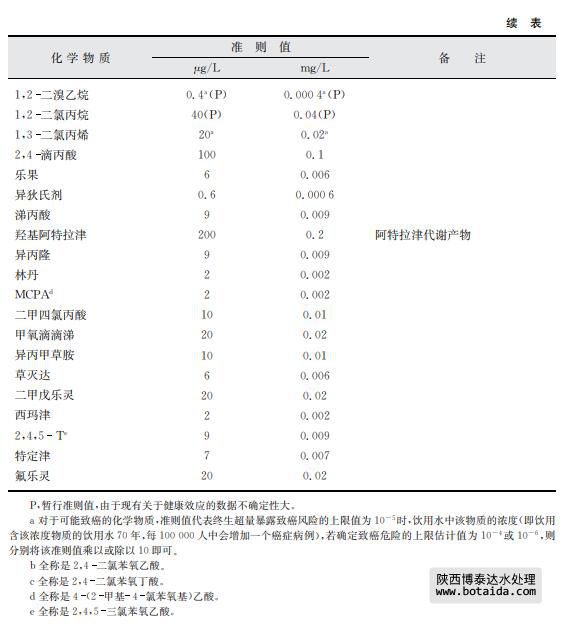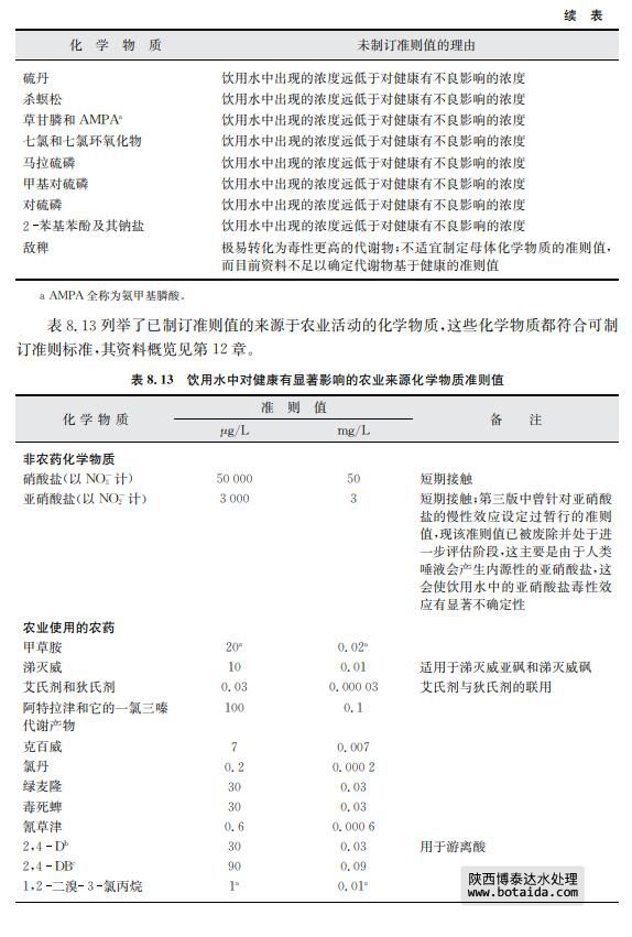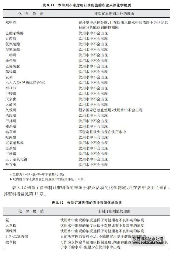 由于一些關(guān)于飲用水中存在化學(xué)物質(zhì)以及其穩(wěn)定性的文獻有明顯證據(jù)指出某些農(nóng)業(yè) 來源的化學(xué)物質(zhì)不會出現(xiàn)在飲用水中,對于此類化學(xué)物質(zhì)本準則不考慮建立準則值(見表 8.11)。