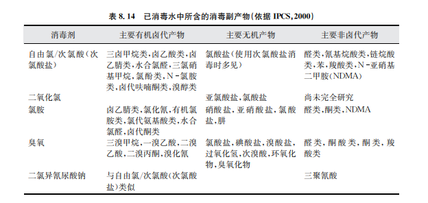 在水處理過程中,有些物質是人為添加進入水體的(直接添加物),有些物質可能不受控 制地殘留在出水中(如鹽類、高分子絮凝劑殘留物或單體)。類似氯胺或自由氯的殘留屬于 有意添加,這些殘留對水質保障有一定好處。其他物質,如消毒副產物,是在消毒劑與水中 通常存在的一些物質相互起化學反應過程中產生的(見表8.14)。氯化消毒副產物和其他消 毒副產物也可能會在游泳池用水中出現,此時吸入和皮膚吸收途徑對人體接觸消毒副產物 更加重要(WHO,2006)。