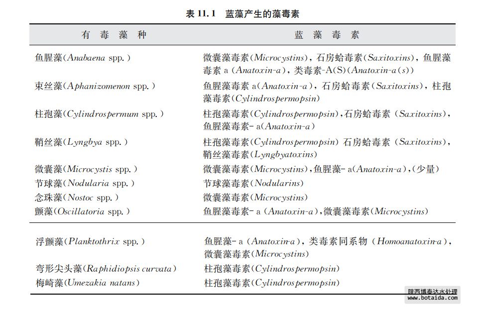 如表11.1所示,許多藍(lán)藻能產(chǎn)生強(qiáng)毒素。在8.5.1.節(jié)中也談到藍(lán)藻毒素。每種毒素都 有其特性,涉及肝損害、神經(jīng)毒性和促癌作用。報(bào)道的急性中毒癥狀有胃腸功能紊亂、發(fā)熱 和皮膚、耳、眼、咽喉、呼吸道刺激。藍(lán)藻在人體內(nèi)不能增殖,因此沒(méi)有感染性。