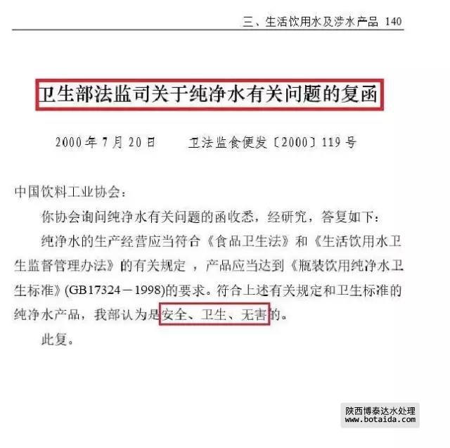 2000年7月20日,衛(wèi)生部衛(wèi)生法制與監(jiān)督司在給中國(guó)飲料工業(yè)協(xié)會(huì)的復(fù)函中說(shuō),純凈水“是安全,衛(wèi)生,無(wú)害的”。