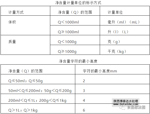 凈含量的標示應由凈含量、數(shù)字和法定計量單位組成。應與食品名稱雜包裝物或容器的同一展示版面標示。