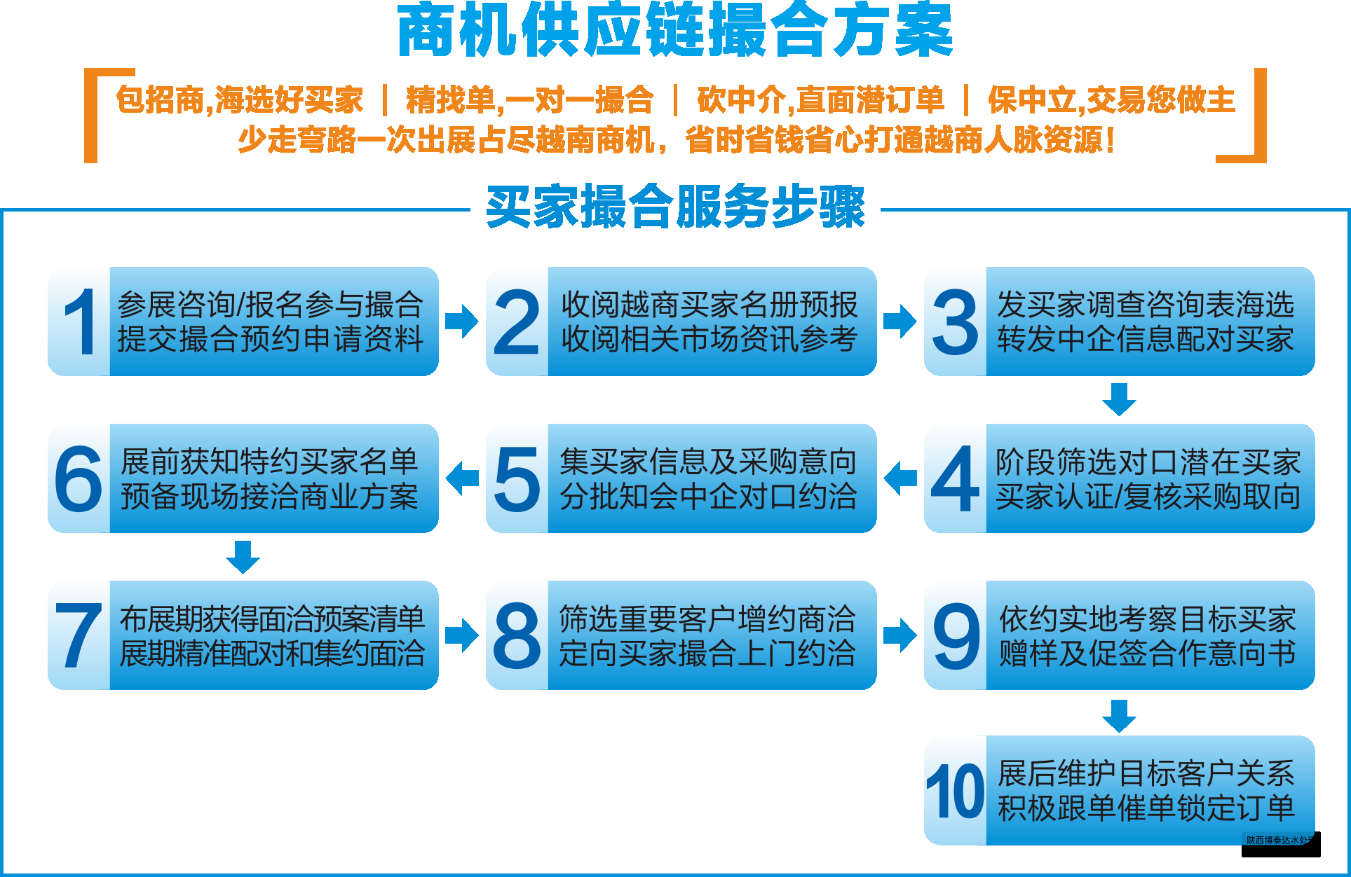 合規(guī)條件:應(yīng)在展前至少60天報名參展參會,并同步填寫及提交《展前撮合越南買家對口面洽預(yù)