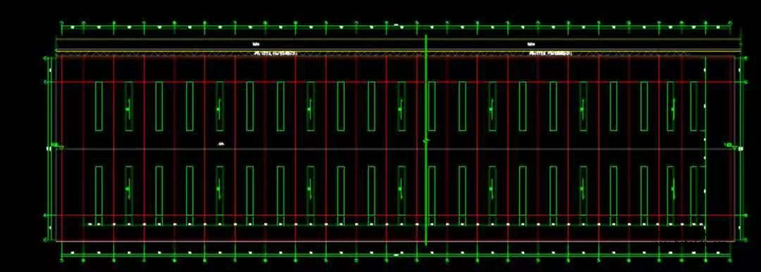 舊熟料堆棚長約 165.5,寬 45 米,高 12 米的料倉。沿兩邊立柱上方跨梁噴設(shè),跨梁共計(jì)數(shù)量 24 個(gè)、鋪設(shè) 23 個(gè),共計(jì)長度約 1035 米。