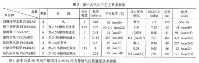 燒嘴冷卻水泵、鎖斗循環(huán)泵、渣池泵、激冷水泵(或灰水循環(huán)泵、黑水循環(huán)泵)、低壓灰水泵、高壓灰水泵(或稱除氧水泵、高壓回水泵、碳洗滌塔給料泵)、過濾機(jī)給料泵等是氣化裝置的關(guān)鍵用泵。