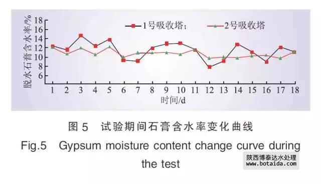 根據(jù)計劃進行臨時管路系統(tǒng)安裝, 從原工業(yè)廢水系統(tǒng)清水池清水泵出口母管直接引出一路管道至1、2號脫硫塔間的地坑。由電廠原有的坑泵將處理后的工業(yè)廢水輸送入脫硫塔工藝用水點, 同時在管路上增設(shè)電動調(diào)節(jié)閥和電磁流量計。首次補入地坑120 m3處理后的工業(yè)廢水, 待地坑內(nèi)坑泵開啟將其輸送至脫硫系統(tǒng)后, 監(jiān)測脫硫塔脫硫效率、石膏品質(zhì)變化; 在脫硫塔脫硫效率、石膏品質(zhì)穩(wěn)定無變化的情況下, 逐步補入處理后的工業(yè)廢水, 并以10 m3/d的梯度逐漸增加。若石膏品質(zhì)明顯下降, 則加大監(jiān)測頻率, 分析原因, 同時停止補入處理后的工業(yè)廢水。在調(diào)試好相關(guān)設(shè)備和儀表后開始進行試驗分析, 內(nèi)容包括脫硫系統(tǒng)整體運行狀況、脫硫效率、石膏品質(zhì)等。
