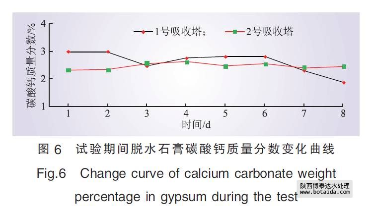 由圖3—7可以看出, 試驗(yàn)期間, 雖然混入處理后的工業(yè)廢水量不斷加大, 但脫硫系統(tǒng)漿液密度均能維持在1 130 kg/m3左右, 且脫硫效率仍然大于或等于95%; 脫硫副產(chǎn)品石膏品質(zhì)未發(fā)生明顯變化, 石膏的含水率基本保持在10%, 石膏中CaCO3質(zhì)量分?jǐn)?shù)小于3%, CaSO4· 2H2O純度大于90%, 符合商用石膏品質(zhì)要求。此外, 試驗(yàn)期間除霧器壓差處于正常運(yùn)行范圍之內(nèi), 吸收塔沒有發(fā)生起泡、堵塞等不正常現(xiàn)象。試驗(yàn)結(jié)果表明, 處理后的工業(yè)廢水可用作脫硫工藝水。