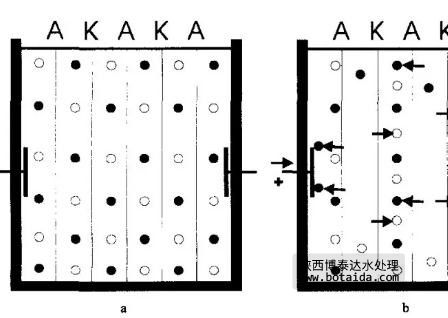 1929年,泡利(W. Pauli)和雅爾科(E. Yalko)首次描述了三室電滲析裝置,置于中間室的料液中的陰離子和陽離子在電場作用下分別進入正極室和負極室。1935年,特奧雷爾(T. Teorell)建立了荷電膜理論,認識到陽離子選擇性透過膜含有帶負電荷的固定離子,陰離子選擇性透過膜含有帶正電荷的固定離子。1939年,馬內戈爾德(E. Manegold)和卡勞奇(C. Kalauch)首次在三室電滲析裝置中同時使用陰離子選擇性透過膜和陽離子選擇性透過膜。