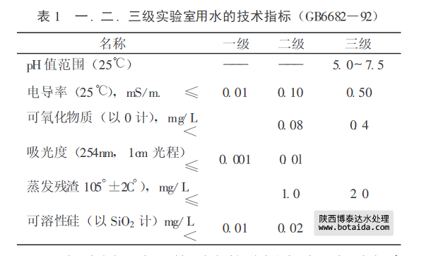 國家標(biāo)準(zhǔn)規(guī)定有分析實(shí)驗(yàn)室用水的技術(shù)指標(biāo)。分析實(shí)驗(yàn)室用水的技術(shù)指標(biāo)見下表,
