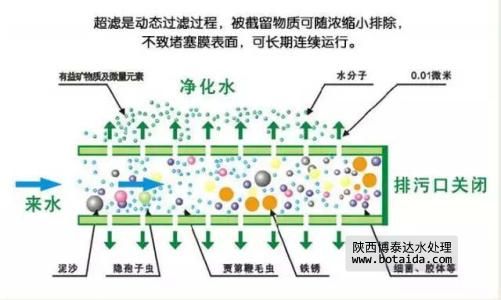 自來(lái)水從濾芯端面進(jìn)入到超濾膜內(nèi)后,在正常水壓的作用下,凈水從超濾膜管壁滲出,而泥沙、鐵銹、膠體、細(xì)菌、懸浮物、大分子有機(jī)物等有害物質(zhì)被截留在超濾膜管內(nèi),并在用戶使用直通自來(lái)水或?qū)V芯進(jìn)行沖洗和反沖洗時(shí)從直通自來(lái)水出口排出。