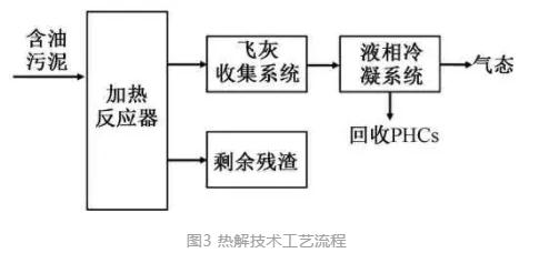 在無(wú)氧條件下,含油污泥經(jīng)高溫?zé)峤廪D(zhuǎn)化為氣、液、固三相,氣相產(chǎn)品以CH4、CO2、H2和CO為主,液相一般為常溫燃油和水,固相殘?jiān)泻薪固?,一般以回收液態(tài)PHCs為主,可不調(diào)質(zhì)達(dá)到回收目的。熱解反應(yīng)在還原氣氛下進(jìn)行,產(chǎn)二噁英極少,其典型工藝流程如圖3所示。